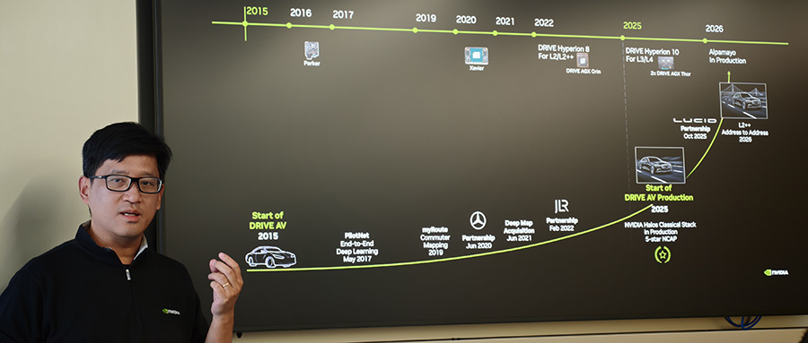 随后的采访环节,吴新宙坦率地回答了包括车东西总编辑张国仁在内的少数媒体的问题,涵盖了技术路线(激光雷达vs纯视觉)、产业竞争(车企自研芯片)、商业逻辑(生态与闭环的平衡)、个人角色以及未来挑战等多个维度。吴新宙的回答既展现了英伟达作为生态构建者的开放野心,也透露出其对自动驾驶十年“执念”的笃定。以下是本次分享与交流的核心内容梳理。