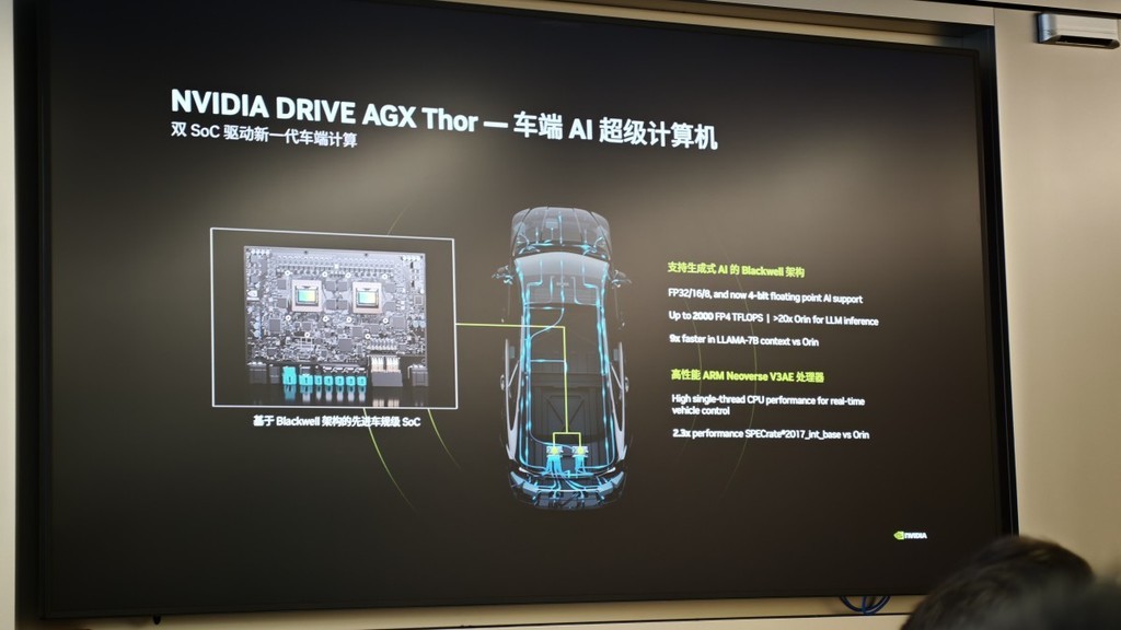 第一层,硬件基石:DRIVE Hyperion的标准化野心。 这是英伟达与行业共同定义的L4级硬件参考架构。其核心是基于Blackwell架构的新一代车规级SoC——DRIVE AGX Thor,提供高达2000 FP4 TFLOPS的算力,专为生成式AI推理优化。